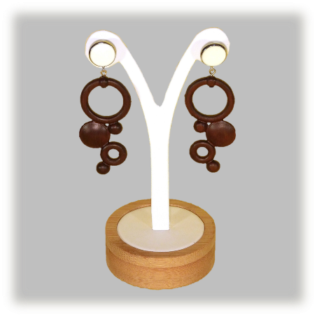 The dark brown-chocolate color of thermowood makes it ideal for jewelry to be worn in the summer. It also highlights the contrasts with other materials, such as rhinestones, precious stones, enamel, etc.