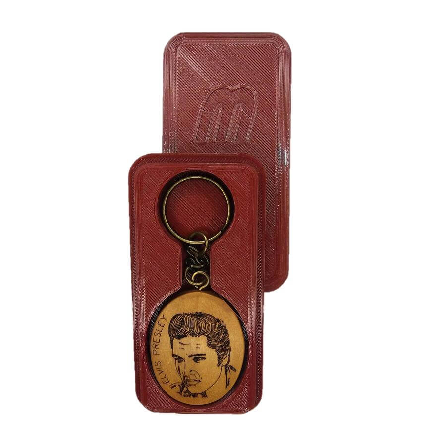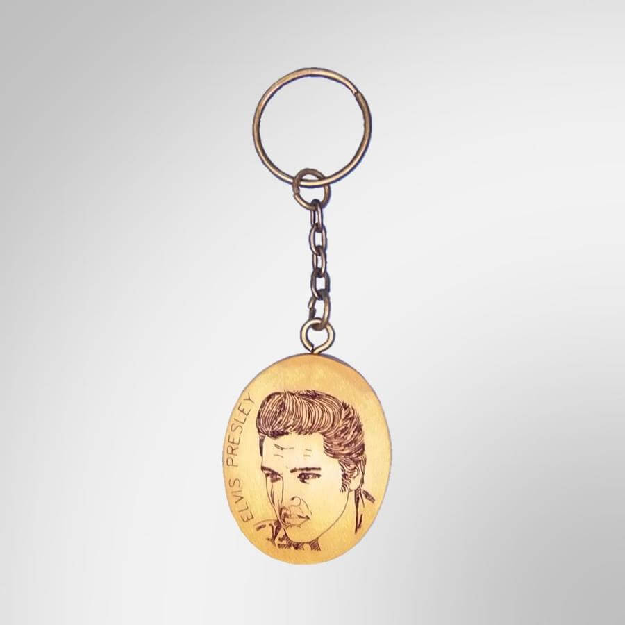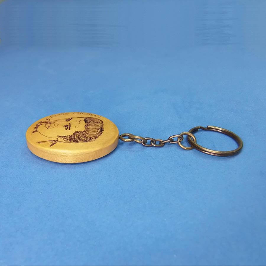 Μπρελόκ κατασκευασμένο από μασίφ ξύλο Tulipwood Αμερικής, με πυρογραφία Laser στις δύο πλευρές του. Η μία πλευρά έχει την προσωπογραφία του Elvis Presley, και η άλλη πλευρά ένα από τα αποφθέγματά του.